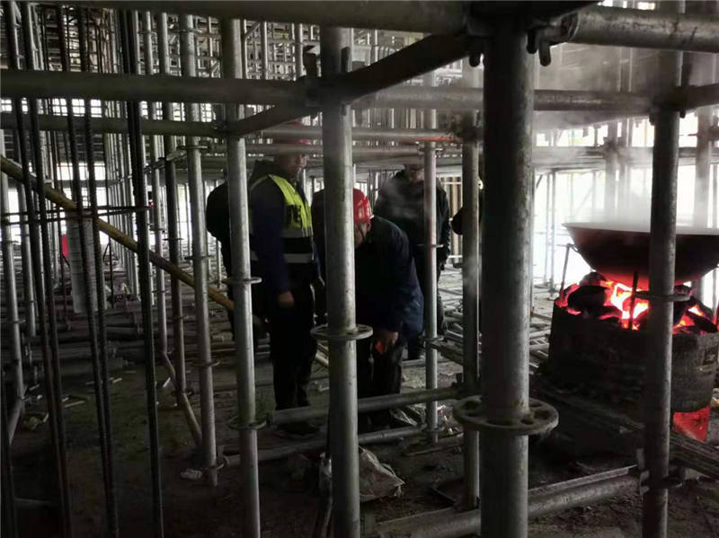 為了確保冬季施工順利進(jìn)行,結(jié)合三個(gè)項(xiàng)目實(shí)際情況,在現(xiàn)場(chǎng)施工方面,各項(xiàng)目搶前抓早,嚴(yán)格執(zhí)行冬季施工方案。通過(guò)對(duì)施工平臺(tái)下部架爐生火并全部搭建保溫棚,對(duì)混凝土底板等外露結(jié)構(gòu)物穿上了“防護(hù)衣”等措施,扎實(shí)有效落實(shí)好混凝土防凍保溫工作,從而保證工程質(zhì)量。