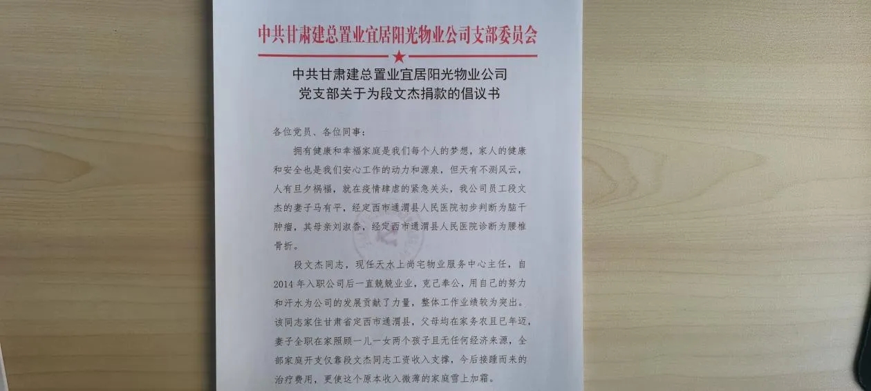 近日,物業(yè)公司天水上尚宅服務(wù)中心主任段文杰的妻子被醫(yī)院診斷為腦干腫瘤,其母被診斷為腰椎骨折,昂貴的治療費用使其家庭背上了沉重負(fù)擔(dān),接踵而來的后期治療費用,使這個原本收入微薄的家庭雪上加霜。