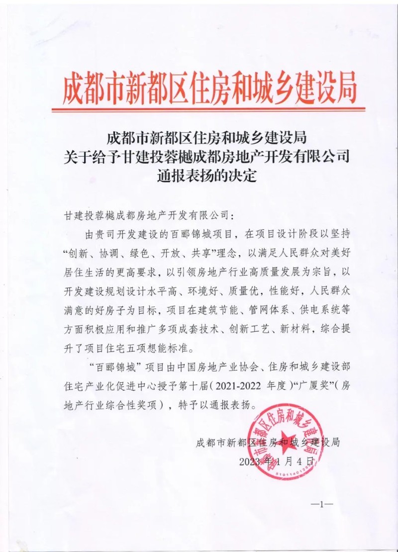 近日,成都市新都區(qū)城鄉(xiāng)和住房建設(shè)局對甘肅建總置業(yè)發(fā)展有限公司成都公司開發(fā)建設(shè)的百酈錦城項目榮獲中國房地產(chǎn)業(yè)最高榮譽“廣廈獎”(2021-2022年度)予以通報表揚。