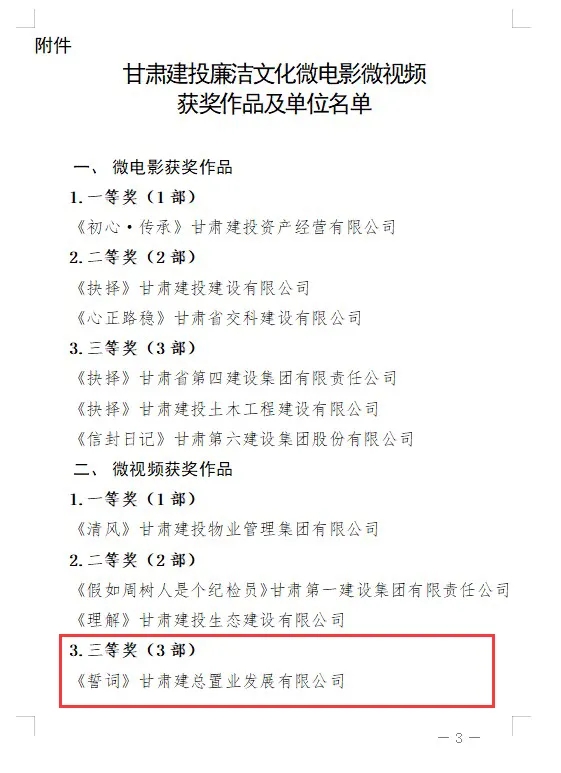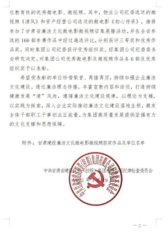 1月19日,在集團公司紀(jì)委2022年開展的全司廉潔文化微電影微視頻評選展播活動中,公司紀(jì)委榮獲“甘肅建投廉潔文化微電影微視頻三等獎”榮譽稱號。