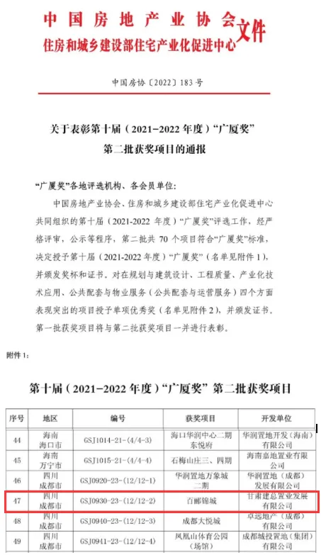 近日,由甘肅建總置業(yè)發(fā)展有限公司成都公司開發(fā)建設(shè)的百酈錦城項(xiàng)目榮獲中國房地產(chǎn)業(yè)最高榮譽(yù)“廣廈獎”。