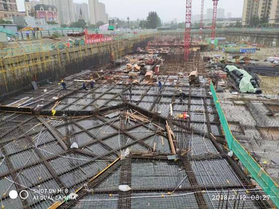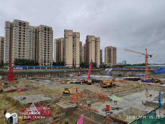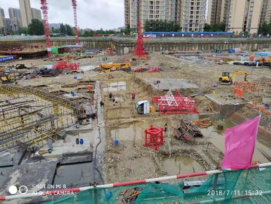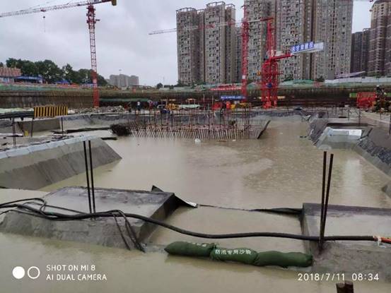 2018年7月,成都遭遇57年來最大降雨,多地出現(xiàn)暴雨橙色預警,四川省啟動II級防汛應急響應。為切實做好防暴雨安全措施,嚴防工地洪澇事故發(fā)生,百酈錦城的青年們組織各方,齊心協(xié)力、緊密協(xié)作,積極開展防汛抗災工作。迅速成立防汛工作領導小組,提前安排部署,啟動防汛搶險應急預案。各單位負責人親赴防汛一線,實地巡查,及時了解汛情。在施工現(xiàn)場張貼防汛標語、設置警戒線,加強防汛沙袋、水泵、汽油等防汛物資的儲備,打好防汛前戰(zhàn)。實行24小時值班制度,專人守護、實時監(jiān)控,密切監(jiān)視汛情,加強汛情信息分析預測、預報、預警,加大對基坑四周的巡查力度,密切關注基坑沉降情況,針對基坑積水、土釘墻漏水等問題,使用挖機挖掘溝道、集水坑,利用水泵抽水至市政管道排走,保障基坑周邊的降水井正常降水。此外,為防止市政停電,現(xiàn)場配備柴油發(fā)電機,保證在停電后一個小時內(nèi),迅速恢復降水。同時加強臨電管控,有雨時除降水井用電外,其余配電箱全部停電。停雨后,分級檢查各設備情況,確認無隱患后,逐級送電。合理分配救災力量,搶險救災有條不紊進行,確保百酈錦城項目安然無恙。