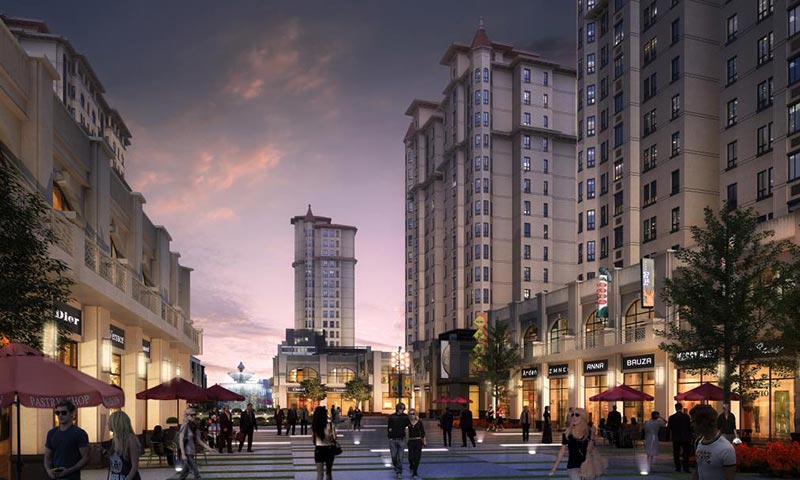 重點(diǎn)打造的絲路金街,由整個(gè)項(xiàng)目的主軸線-----商業(yè)步行街及500米帶狀公園組成。整體設(shè)計(jì)中突出強(qiáng)烈的絲路元素,以“流動(dòng)的彩綢”為設(shè)計(jì)靈感,將13000公里長的古絲綢之路全程按1:15000的比例進(jìn)行了完美濃縮,以沿途最重要城市為節(jié)點(diǎn)打造的五大主題雕塑群將整條金街完美相連。