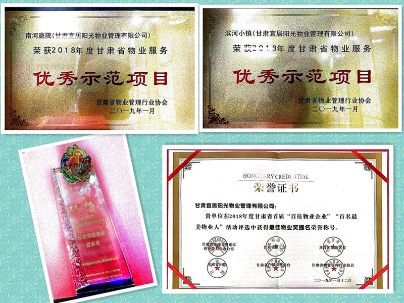 1月12日, 在甘肅省首屆“百家物業(yè)企業(yè)”、“百名最美物業(yè)人”評選活動頒獎晚會中,置業(yè)公司旗下的宜居陽光物業(yè)管理有限公司榮獲“最佳物業(yè)企業(yè)提名獎”,南河庭院項目主任金蘭榮獲甘肅物業(yè)行業(yè)貢獻獎。同日在首屆甘肅省省優(yōu)示范項目評定中由宜居陽光物業(yè)管理的南河庭院物業(yè)項目、濱河小鎮(zhèn)物業(yè)項目均獲得“甘肅省物業(yè)服務優(yōu)秀示范項目”的榮譽稱號。